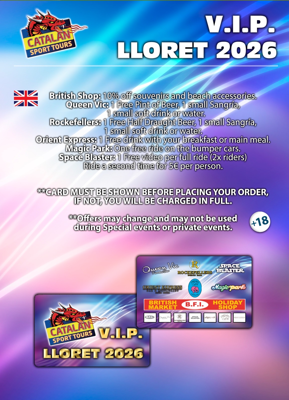 When booking any one of our Transfer packages, for every person booked, you will receive one of our CST VIP cards.Your CST VIP card has many advantages, such as a free PINT OF BEER or GLASS OF HOUSE WINEÂ at the QUEEN VIC PUB LLORET DE MAR (from Easter onwards), it also includes discounts at British SuperMarket LLoret , discounts on water sport activities , shots at Rockafellers night club Lloret, MAGIC PARK FREE TOKEN FOR A BUMPERCAR RIDE and more.